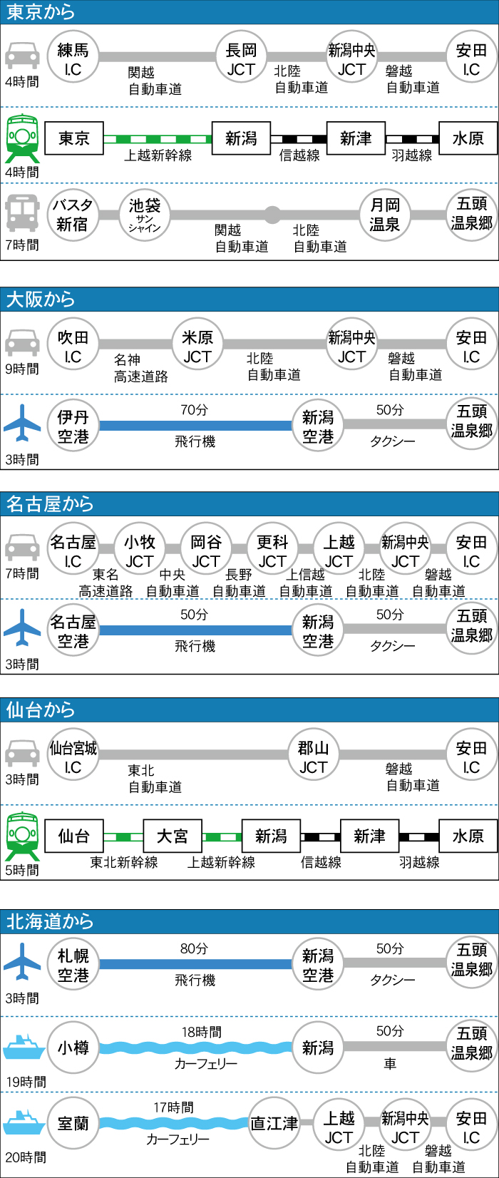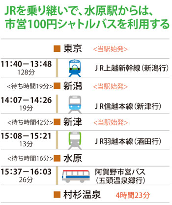 バスタ新宿、池袋サンシャインシティーから、五頭温泉郷・村杉温泉うららの森まで乗り換えなしで到着です。