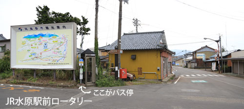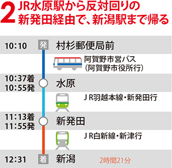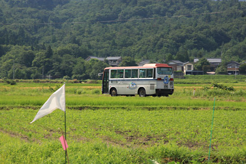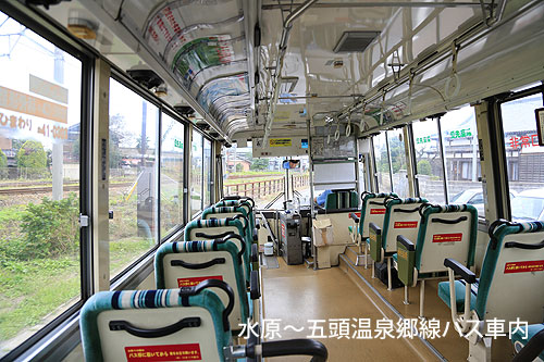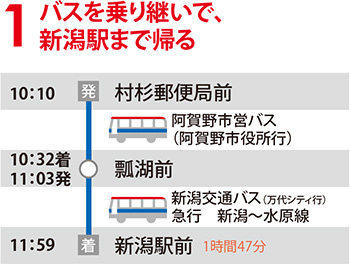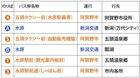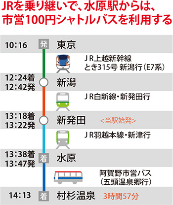 どこで乗っても降りても、1回100円の循環バス。水原駅から村杉温泉までは25分。