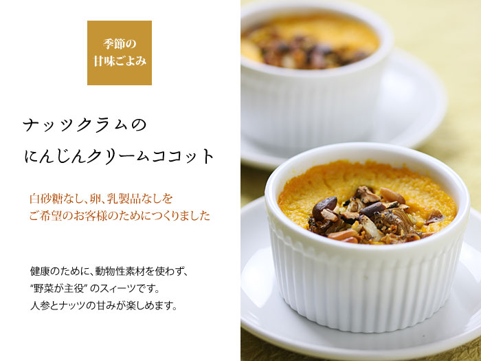 白砂糖を使わない玄米菜食・マクロビオティック風のお料理をご希望のお客様はお気軽にお申し付けください。 このほかにも、てんさい糖、メープルシロップなどでお料理を作ることができます。