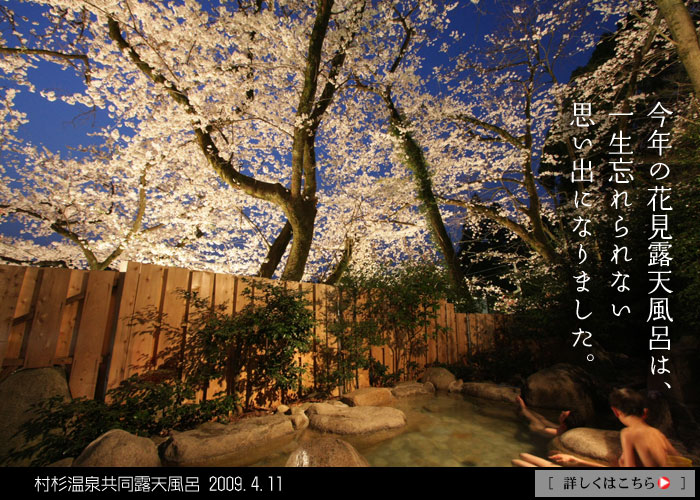 露天風呂の付いているお部屋は、村杉共同露天風呂に面しているため、部屋の露天風呂に入りながら、遠くにライトアップされている夜桜を愉しむことができます。