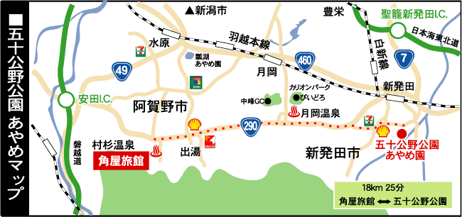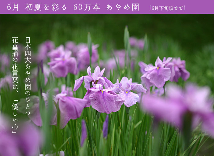 村杉温泉から車で30分。お隣の新発田市のあやめ園が見頃を迎えます。 およそ300品種、60万本のあやめ(花菖蒲)が咲き誇る五十公野(いじみの)公園のあやめ園は、日本4大あやめ園の一つに数えられているほどです。
