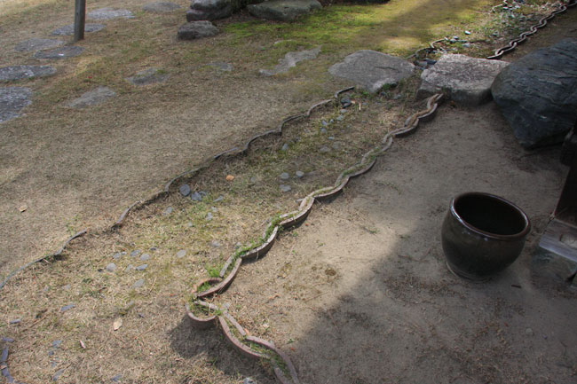 | 二宮家の門をくぐって、右手はバラ園、左手は日本庭園になっています |