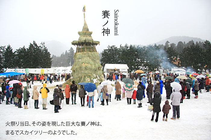 秋の稲刈りの頃、農家の人たちは、冬に賽ノ神を作るために、たくさんの稲わらを集めて、納屋に保管します。 昔の暮らしには稲わらで色々な農具、民具など生活必需品を作っていたので、稲わらは長いまま保管するのが習わしでした。