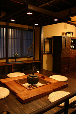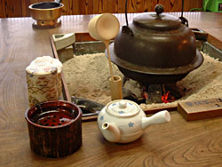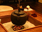 高級旅館と違い、田舎の囲炉裏のある宿ですので、不釣り合いなお抹茶などはお出しいたしませんが、お客様が自由に集うことができる【茶の間】の大きな鉄瓶の中には、角屋旅館の露天風呂から見える庭から湧き出ている、「銀蔵清水」が沸いています。 夕食後の一服、朝のご出発前のひと時にご自由にご利用ください。