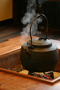 静かに湯気を立てているのは、古民具の大きな鉄瓶です。