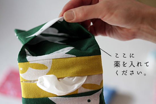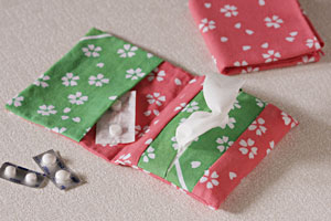 ティッシュケースに小物入れのポケットが付いているから、クスリも入れることができます。バッグのなかで錠剤が行方不明になることもありません。