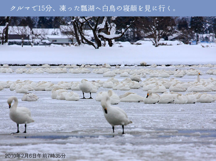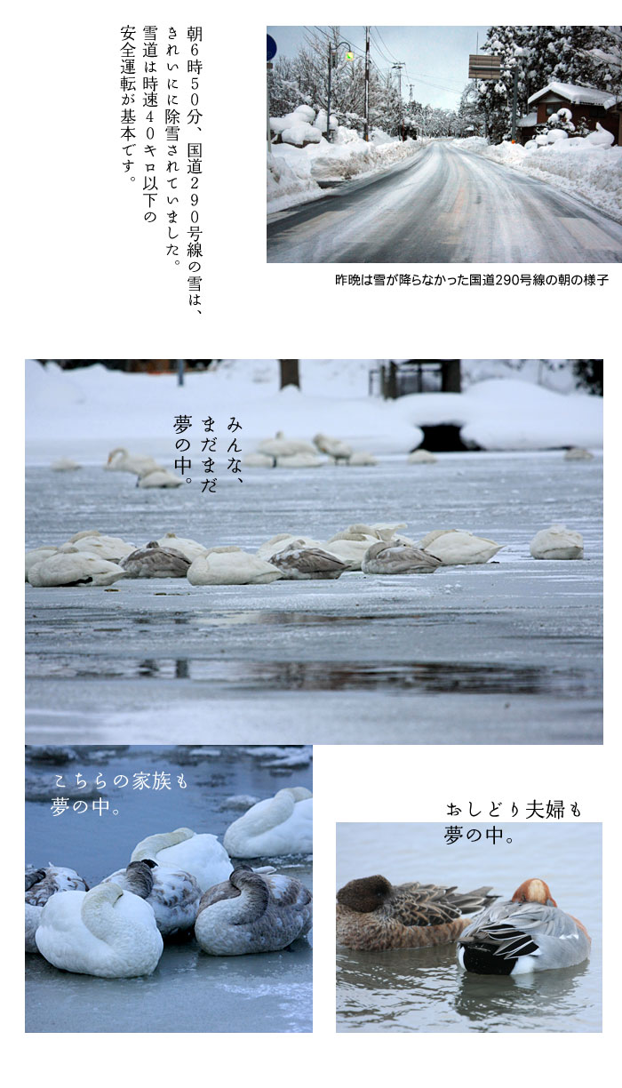 今日は、朝早く瓢湖まで来ましたが、残念ながら曇り空のため白鳥が飛び立つ雄大な姿は見ることができませんでした。白鳥たちは、その日の気温天気によって瓢湖を飛び立つ時間が変わります。