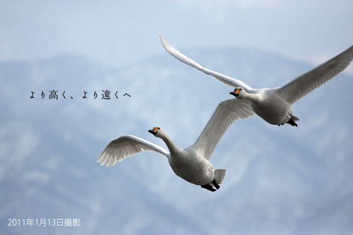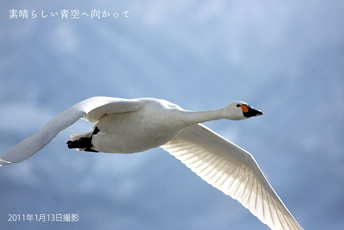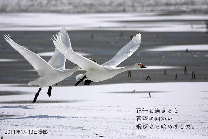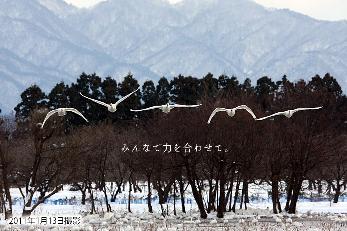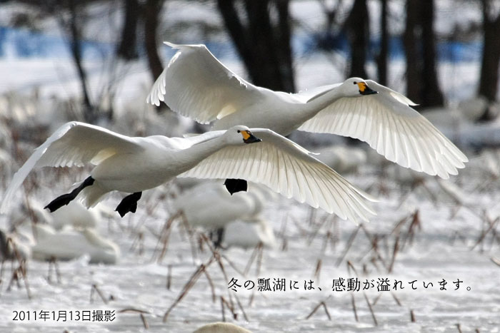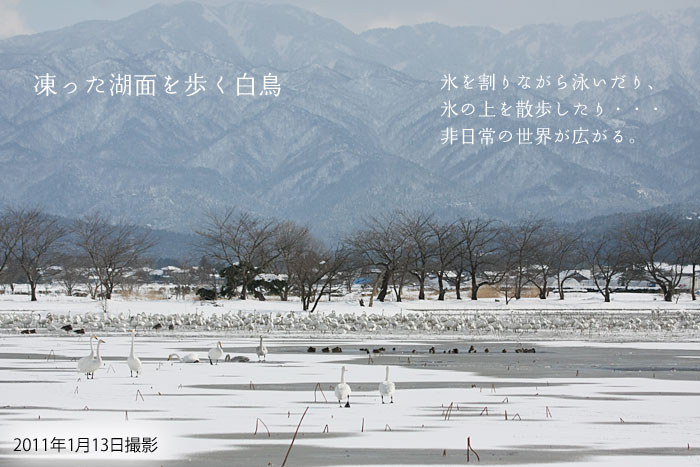 平成23年1月10日 | 今日の瓢湖は美しい白鳥の湖でした 3日間雪が降り続きました。気温が氷点下になる程の寒い日でしたが、こんな日は瓢湖の白鳥たちも餌場にしている田んぼが凍るので、暖かくなる時間まで、瓢湖でゆっくり待っています。 ご宿泊の翌日の帰り道こそ、絶好の白鳥見学時間になります。 |