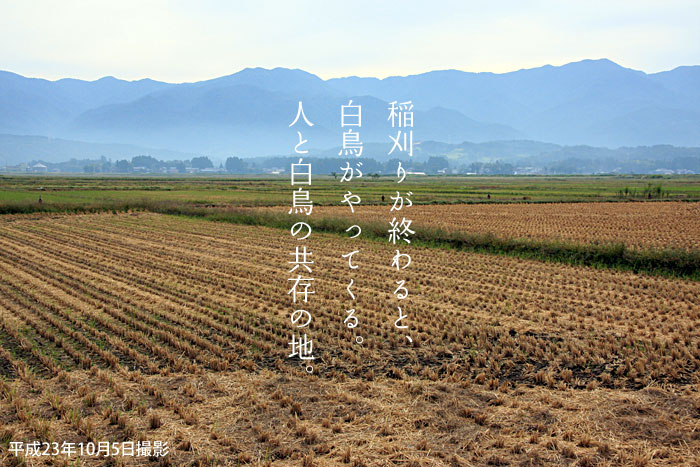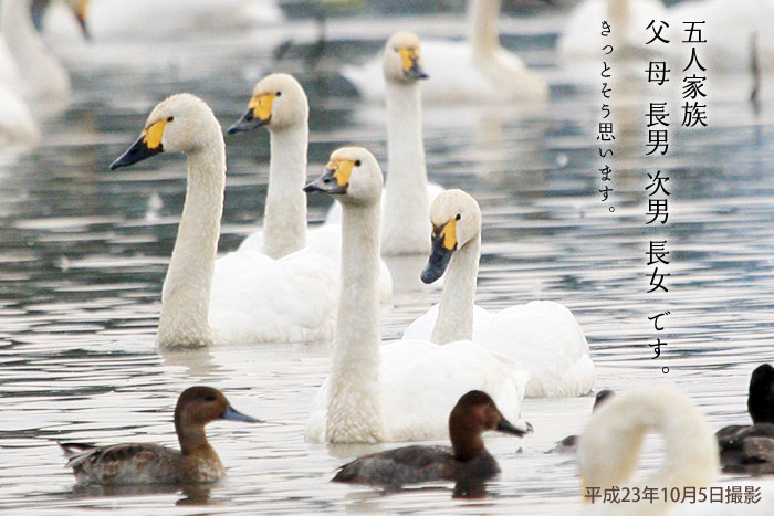 これから6ヶ月 白鳥と暮らす 私たち 当地の小学生に、「鳥の名前を一つ言ってみて?」 と尋ねると、90%の子供は 「白鳥」 と答えます。 白鳥たちが夜を過ごすのは、獣に襲われることのない安心な瓢湖です。 白鳥と人の共存できるのは、それぞれに互いを思いやる心があるからだと思います。 |