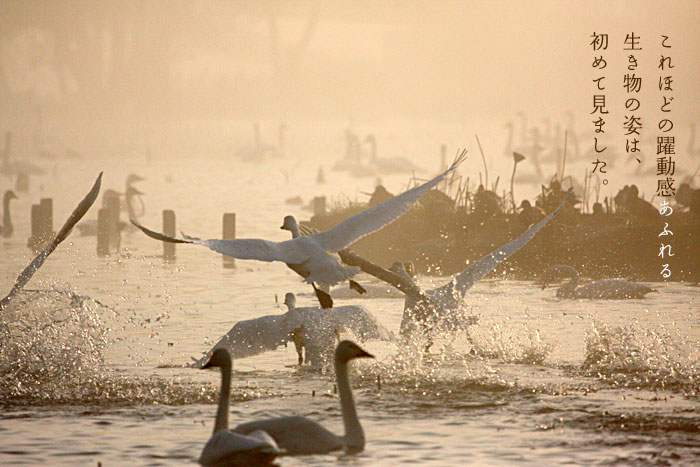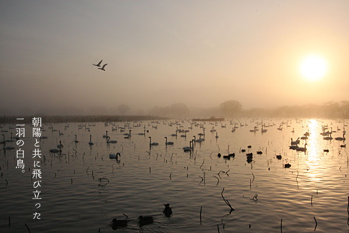 平成23年11月1日 | 今日から白鳥見学バスが今年も運行します 早朝の白鳥バス 今日はその初日でした。 お客様と一緒に白鳥バスに乗って、感動的な朝もやの朝陽を楽しんできました。 こんな感動的な朝はとても貴重な体験です。 感動は健康の源です。 |