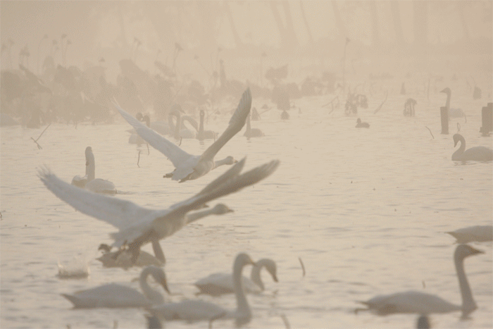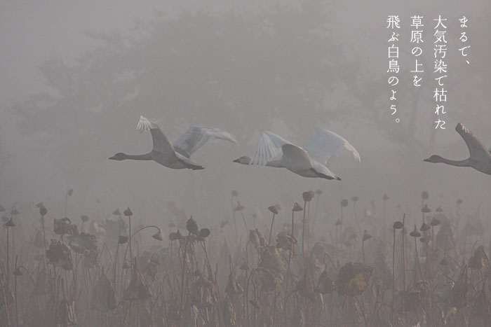| 本当は、違います。 ラムサール条約にも登録されている、野鳥たちの楽園なのです。 夏に湖面を覆いつくしていた蓮の花が、徐々に枯れていくのですが、すべて消えるのは雪が降る12月頃になります。 11月初旬には、このような不思議な写真が撮れるのです。 |
