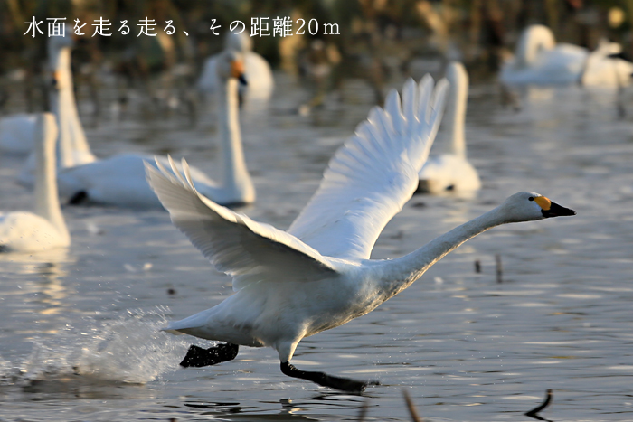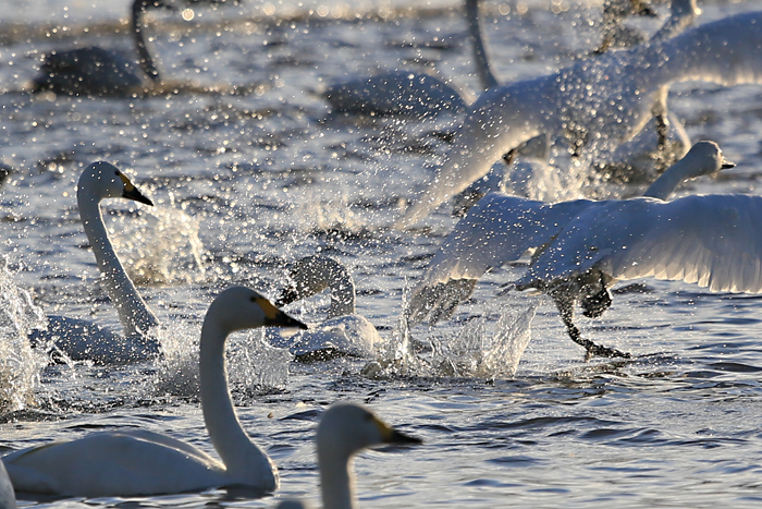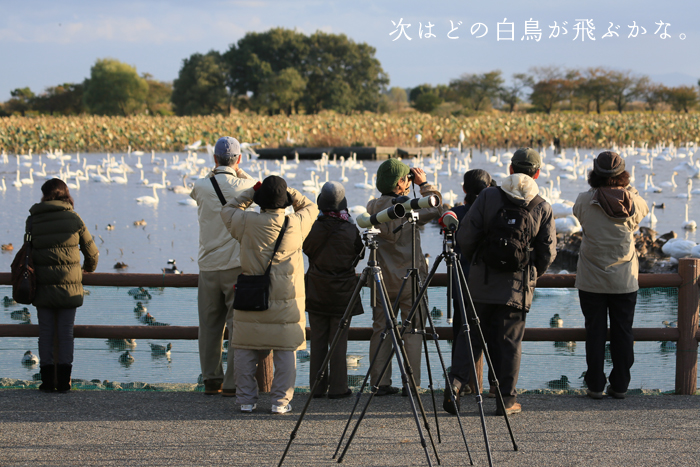 目の前で見る白鳥の躍動感と数の多さに、見学バスツアーに参加した方々は、とても感動したそうです。 |