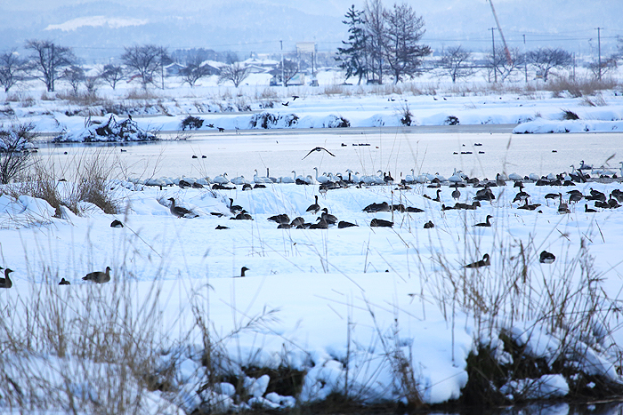 ビュー福島潟の近くにたくさんのオオヒシクイや白鳥や色々な野鳥たちが集まっています。