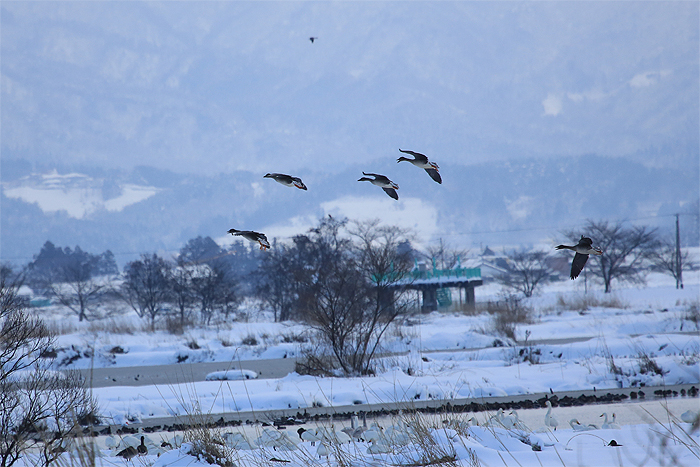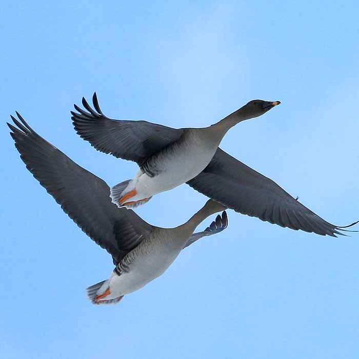 オオヒシクイの飛行中は、羽の下に格納された足ってカワイイ。