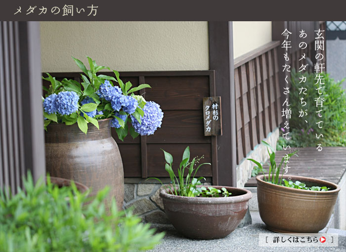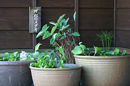 村杉の池に住むメダカを、知っていただきたくて、軒先で大切に飼っています。