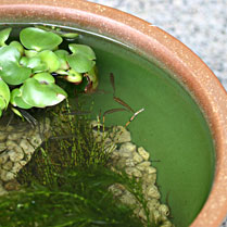10日後から睡蓮鉢の中の水草に産卵を始めました。