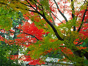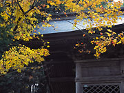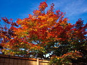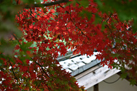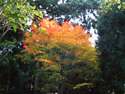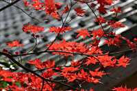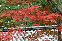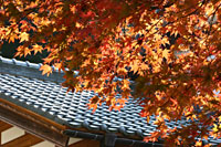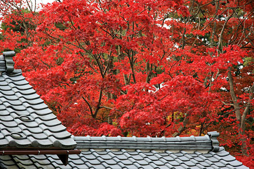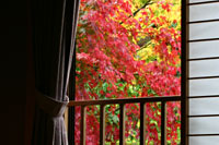 旅館の屋根越しに見えるもみじが真っ赤に燃えていました。