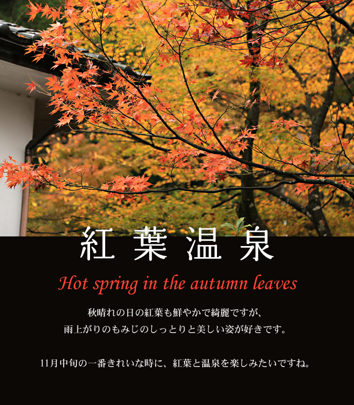 温泉街を歩いて小さな秋を見つけてみたり、 露天風呂から紅葉を見上げながらゆったりと温泉三昧。 わずか10室の昔のままの温泉宿ですから、 静かに紅葉を満喫できるでしょう。 紅葉シーズンのご予約はお早めに・・・