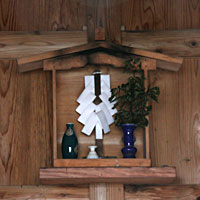 建物の中には、神棚が設えられており、温泉の神様が祀られている。 源泉温度は26.5℃のため、夏場は気温より低く、冬場は暖かく感じる。秋になれば、湯気でガラスが曇るようになる。