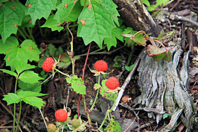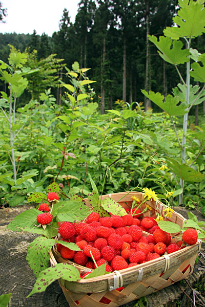 6月になると周囲の野山は、宝の山になります。 赤や黄色、オレンジの野いちごが緑色の葉の下に見え隠れしていました。