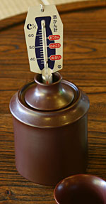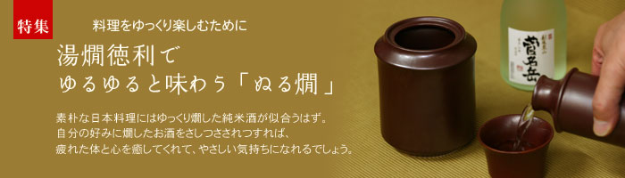 80℃くらいで火を止めたお湯の中に徳利を入れて、ゆっくり湯煎するのが、やわらかで美味しい「ぬる燗」ができます。 沸騰しているお湯の中に入れてしまうと、お湯から出した後もどんどん温度が熱くなり、すぐに熱燗になってしまいます。 湯燗徳利なら、ポットの熱いお湯をいれて約1分で「40℃のぬる燗」が出来上がります。その後も、お湯の温度が適度に下がるため、徳利のお酒をゆるゆると飲み続けても、最後まで熱すぎず、ぬる過ぎないお酒を楽しむことができます。
