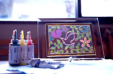 ガラスに絵や文字をペイントします。カラフルな色合いでオリジナル作品を作ります。お子さんでもできます。