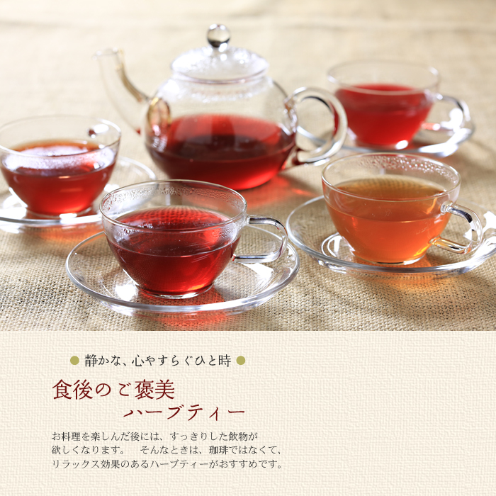 食後のハーブティーは、心とカラダがゆるゆると安らぎます。カフェインフリーなのでいつでも安心です。