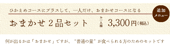 基本のお料理コースは 【ひかえめコース】 のままで、ご希望の人数分だけ追加セットを注文することで、【おまかせコース】 に近いボリュームにすることができます。