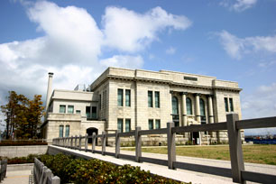 旧第四銀行住吉支店 昭和2年に建てられた古典的な銀行様式の建物です。 外壁には花崗岩を使用し、正面入口には4本の石の柱が並びます。この柱とアーチ形の窓が銀行様式の特徴です。