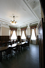 内部は、天井の高いロビー部分はレストランのため、食事以外の人は入れませんが、一階のそれ以外の部分と2階の会議室などは自由に見学することができます。