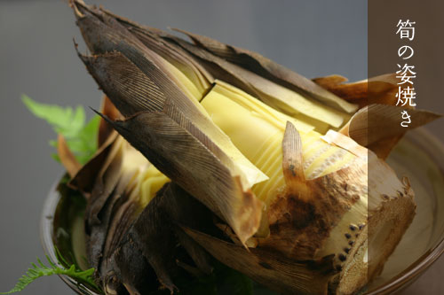 一本丸ごと焼き立てを味わうことができます。 アツアツの湯気とともに広がる甘い香りは、姿焼きならではのもの。 食べやすく切ってお出しすることもできますので、ご希望の時はお申し付け下さい。 筍の姿焼き 一本 1,500円 (諸税別)