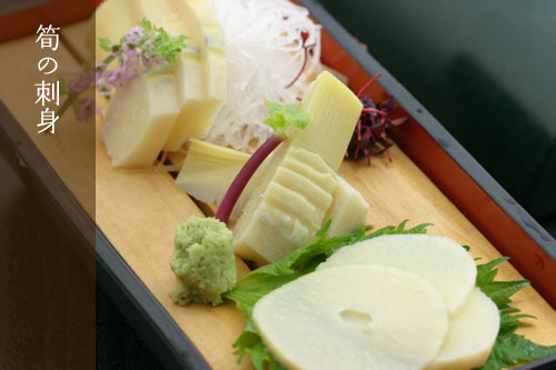 穂先・中央・根本などそれぞれの部位ごとに違った食感が楽しめます。 わさび醤油でどうぞ。 筍の刺身 一人前 400円 (諸税別)