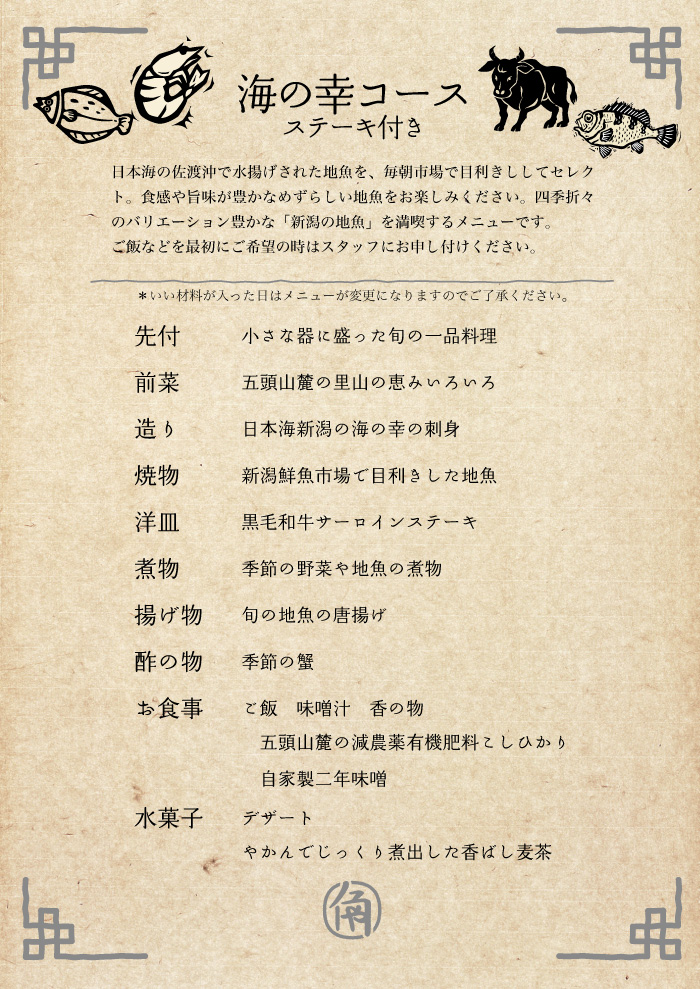 海の幸料理コース+ステーキ付でとても新鮮なお魚とやわらかいお肉が食べられてうれしかったです。