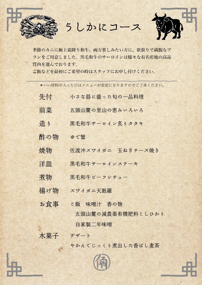 角屋旅館の「かにうしプラン」で宿泊しました。本当にカニと牛のいろいろな味を堪能できて満足でした。量が多く残すのが申し訳ないほどでした。雰囲気も接客も良くゆったりとくつろぐことができました。