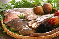 | アジ 巻貝 南蛮 平目 オコゼ ワラサ アイナメ ヤナギ 黒ダイ コチ ザコシ ハモ サザエ レンコ ハチメ ハマチ |