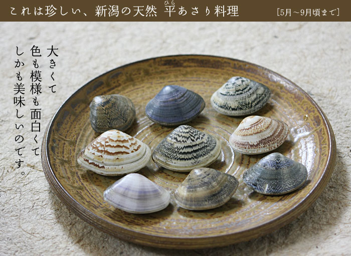 新潟の昔ながらの食べ物を大切にしたい私たちは、とても貴重な「新潟野積海岸の天然平あさり」を、この夏の料理としてご紹介します。 このあさり料理は5月〜9月頃まで、「ひかえめ料理」や、「おまかせ料理」 「海の幸料理」などで味わうことができます。