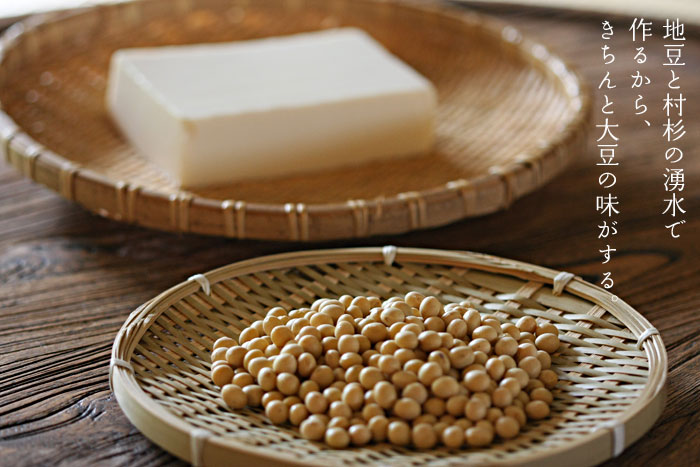 地域の昔ながらの食材を大切にする角屋旅館では、地元の農家の大豆と、村杉の湧水、にがりだけを原料に、村杉で作った豆腐をご用意しています。