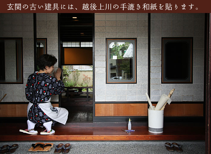 この古い建具に使う障子紙は、地元の小出和紙です。その土地で収穫された楮(こうぞ)で作る昔ながらの味わいのある和紙です。