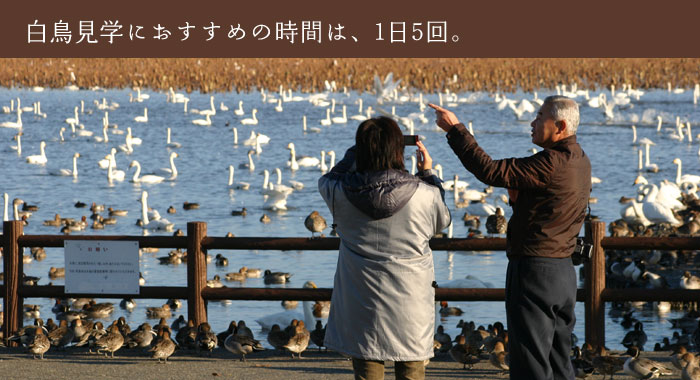 昼間は水田や河川にいる白鳥も、1日3回のエサの時間は、周囲の水田から瓢湖にエサを求めて戻ってきます。
