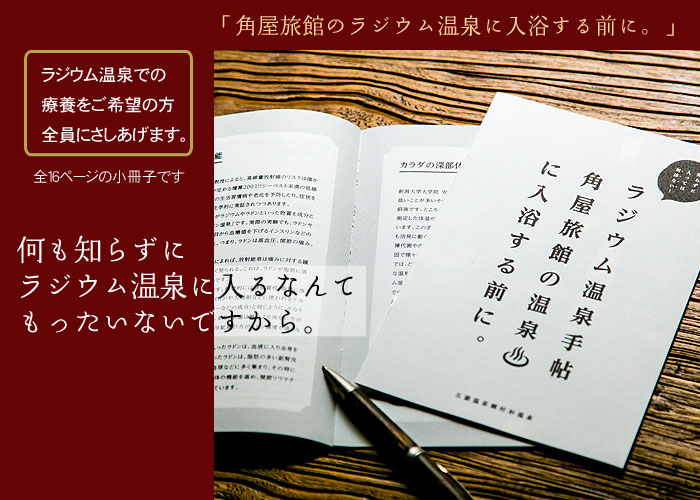 ラジウム温泉のしくみ、2泊3日湯治のための正しい入浴法、温泉散歩地図など、ポケットに入ってしまうほどの小さな冊子ですが、知りたかった最新情報がぎっしり詰まっています。