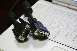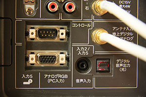 【テレビとパソコンの接続方法】 32インチ地上BSデジタルハイビジョン液晶テレビに、PC入力ミニD-sub15ピン端子付きディスプレイケーブルを接続します。
