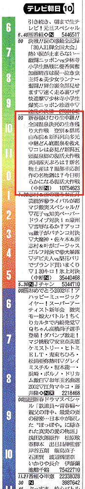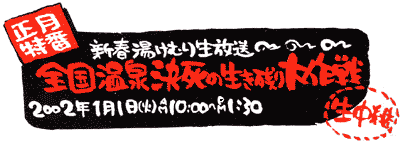 皆様に愛されて色々がんばってきた五頭温泉郷が、 ついに全国放送でテレビデビューしました。 テレビ取材期間2ヶ月。泊り込みの撮影実日数35日間。 元旦は、なんと生放送3時間30分! 全国の皆さんに応援していただきました。 ―――テレビ朝日系列 正月特番――― 新春!湯けむり生中継! 全国温泉決死の生き残り大作戦 2002年1月1日(火) AM 10:00〜PM 1:30