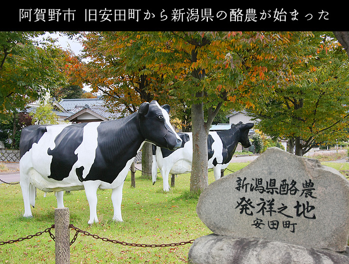 阿賀野市安田が酪農発祥の地といわれるのは、旗野美乃里(はたのみのり)が、明治31年(1898年)、当時23歳の時に、林業視察のためにヨーロッパを訪ねた際に、日本人の体格を西洋人並みにするには食生活の改革が必要、なかでも乳製品が大切と考え、帰路に経由したアメリカでカナダ産の乳牛3頭を購入してきた事によります。