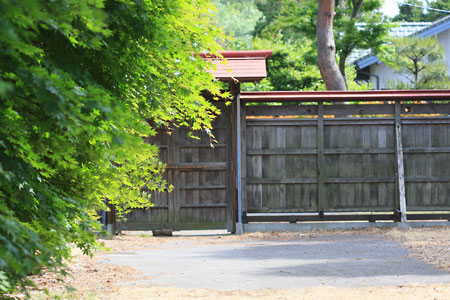 | 二宮家の門をくぐって、右手はバラ園、左手は日本庭園になっています |