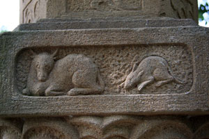 | ぐるぐる回りながら見ていると、十二支の動物が刻まれていることに気が付きました。 これは、子 牛。 |