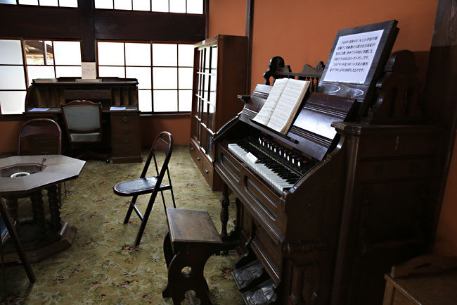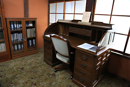 洋風な家具が並ぶこの部屋には、細工が細かく丁寧なヤマハのオルガン、テーブル式の囲炉裏、革張りチェア、ライティングデスクなど。 |