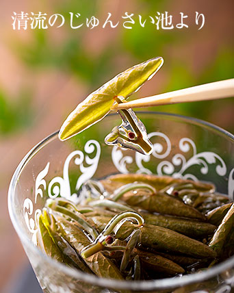 じゅんさいが育つのは、水のきれいな池だけ。睡蓮の葉の若芽をイカダに乗って手摘みで集めています。貴重な昆虫もいるマニアには知られた場所です。特にトンボの種類が多い楽園です。